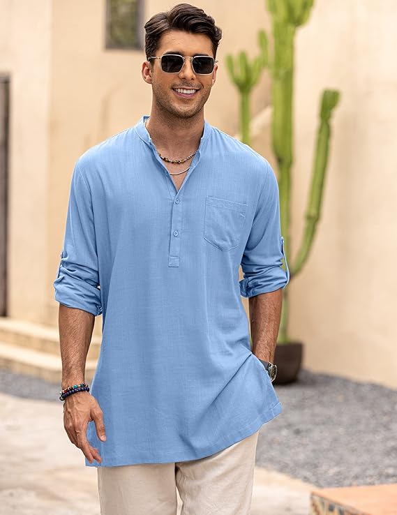 4. Men – Linen Henley Shirts Long Sleeve Collarless Longline Kurta
