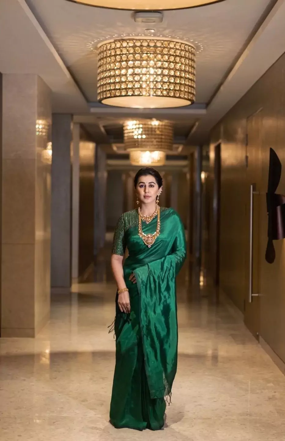 5. Shwetha Menon’s peacock green Kanjivaram saree is a perfect pick for Navratri celebrations, combining traditional elegance with a festive flair.