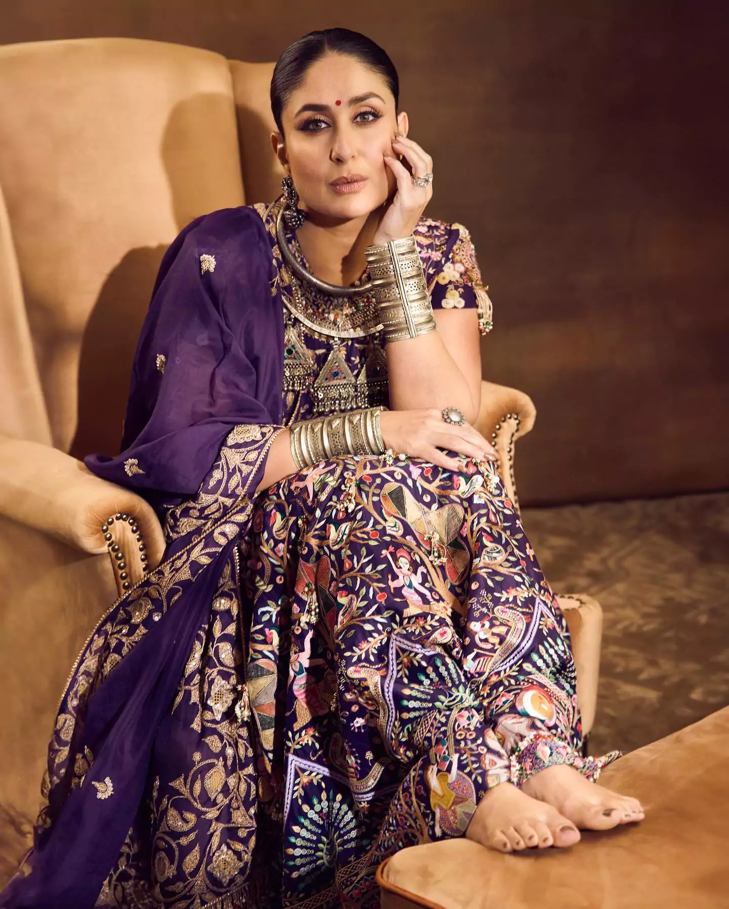 6. Kareena Kapoor showcasing a full-length purple lehenga while seated, highlighting silver bangles and bold accessories.