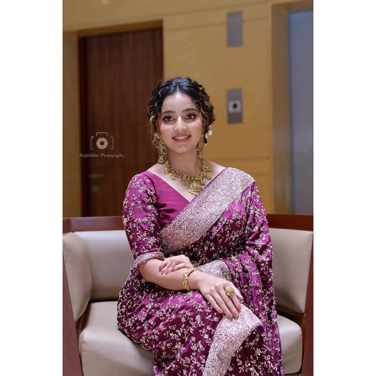 Malavika draped a beautiful embroidered purple saree with detailing all-over the body of the saree which added rich-look to the styling